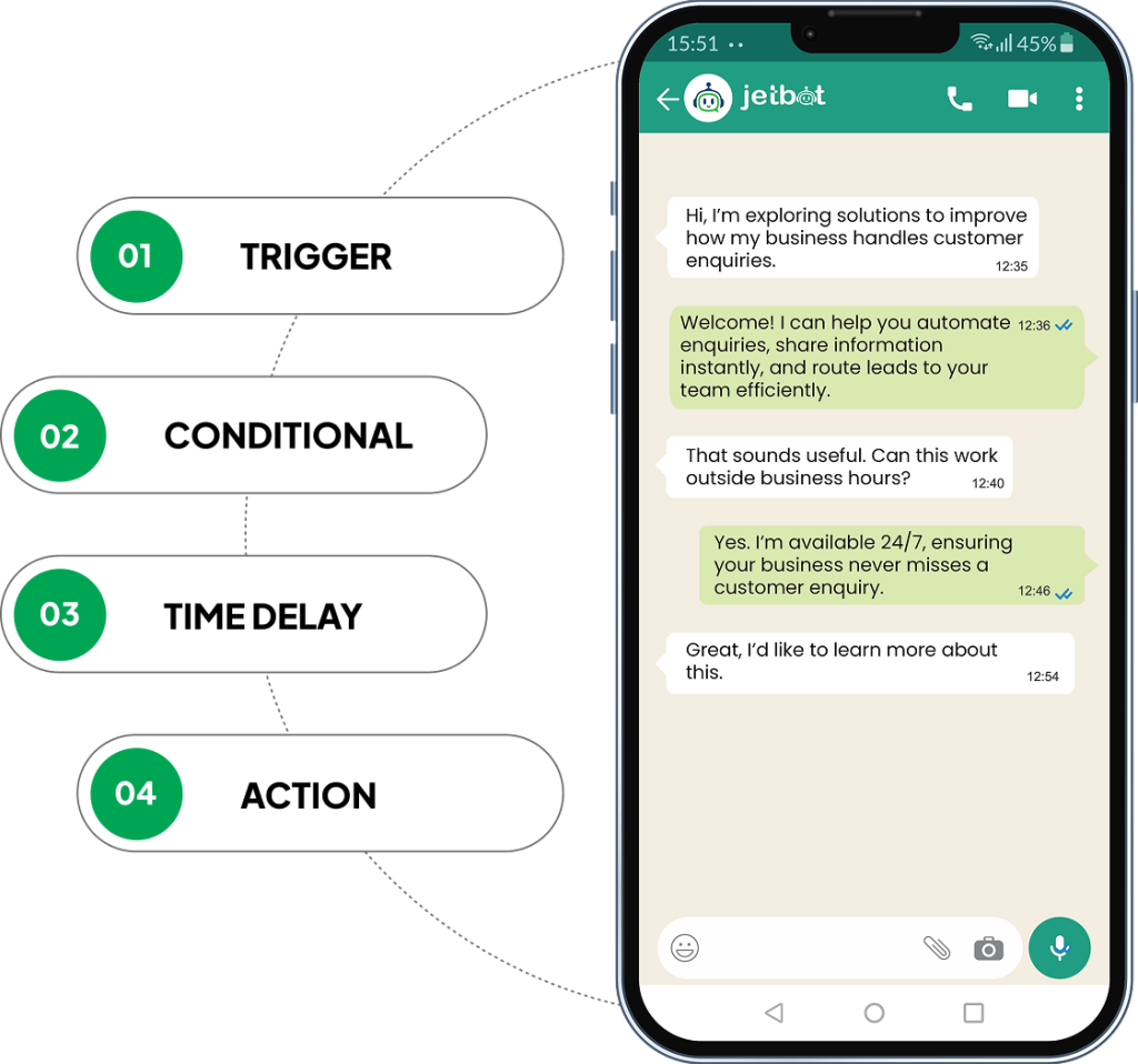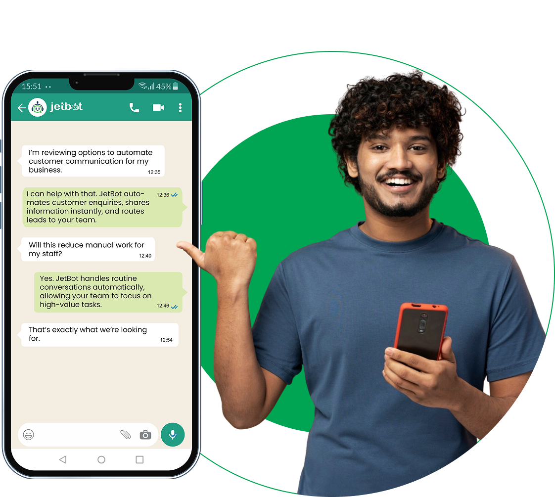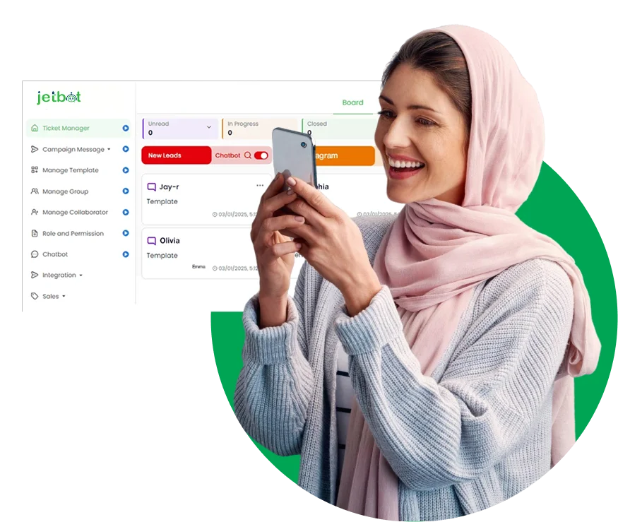 Jetbot is an all-in-one WhatsApp Business API platform that helps businesses automate conversations, send bulk messages, manage customer chats, and integrate WhatsApp with sales and support workflows.