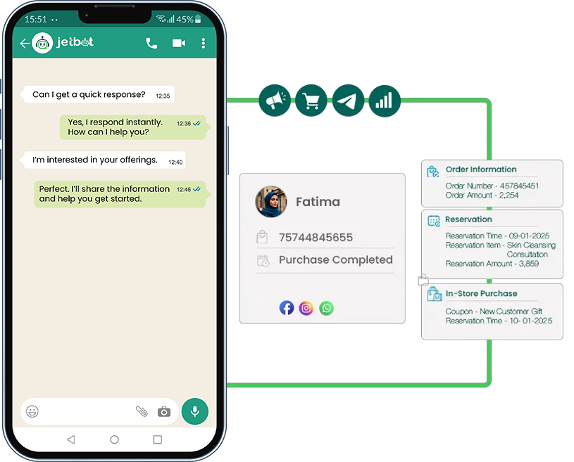 Connect Jetbot with your advertising and business tools like Meta Ads platforms and CRM systems. Convert ad clicks into WhatsApp conversations and monitor performance in real time.